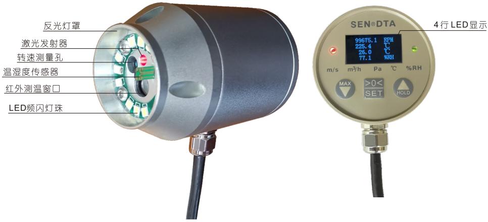 集激光轉(zhuǎn)速,同步頻閃,非接觸紅外測(cè)溫,環(huán)境溫濕度綜合測(cè)量,變送,控制于一體的小型多參數(shù)綜合探頭