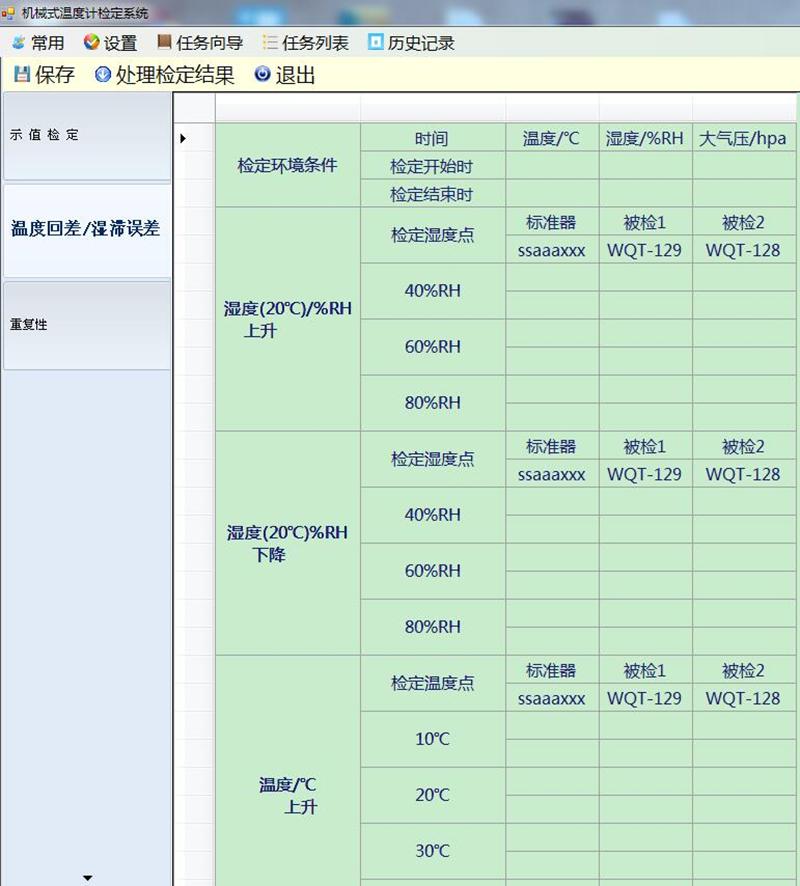 控制程序軟件:檢定人員輸入檢定信息后,程序自動(dòng)控制設(shè)備升降溫及升降濕,自動(dòng)監(jiān)控標(biāo)準(zhǔn)器變化,變化率達(dá)到要求后,自動(dòng)采集標(biāo)準(zhǔn)及被檢的數(shù)據(jù)像圖,檢定完成后自動(dòng)關(guān)閉溫濕度標(biāo)準(zhǔn)箱。待人員完成人工識(shí)別后,填寫(xiě)對(duì)應(yīng)數(shù)據(jù),按照相應(yīng)的檢定規(guī)程或校準(zhǔn)規(guī)范自動(dòng)進(jìn)行數(shù)據(jù)處理,形成獨(dú)立的記錄表格及證書(shū)。